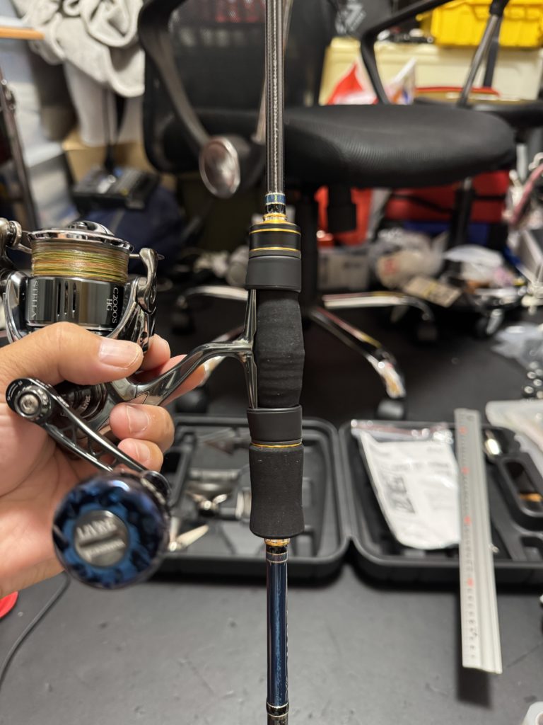 第二に、グリップです。やはり「大きい2kgぐらいのイカがかっかった時」を想定すると、オリジナルのグリップはやや心許なく感じます。私も購入後すぐに滑り止めを巻くなどの改造を施しました。ただし、リールを装着した際のバランスは全く問題なく、この点は付け加えておきます。